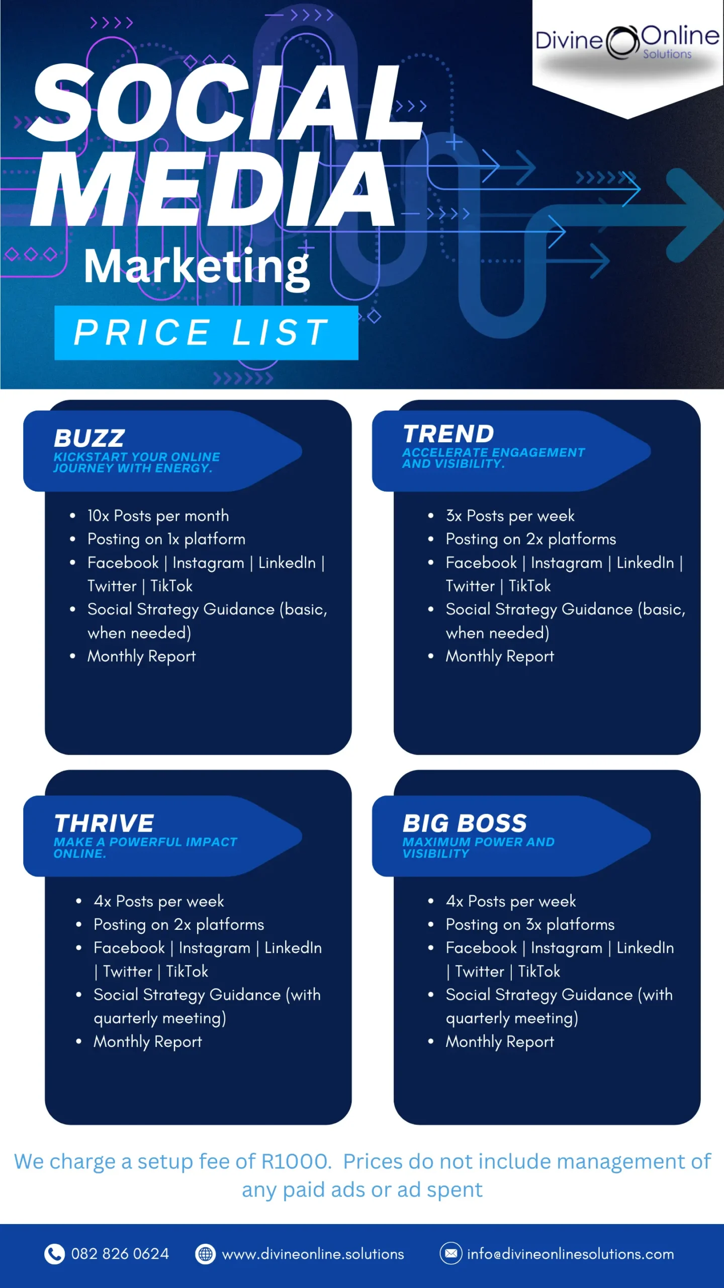 Please note that a once-off setup fee applies, and our services focus on organic social media management. Paid advertising management and ad spend are not included, allowing businesses to maintain full control over their advertising budgets.